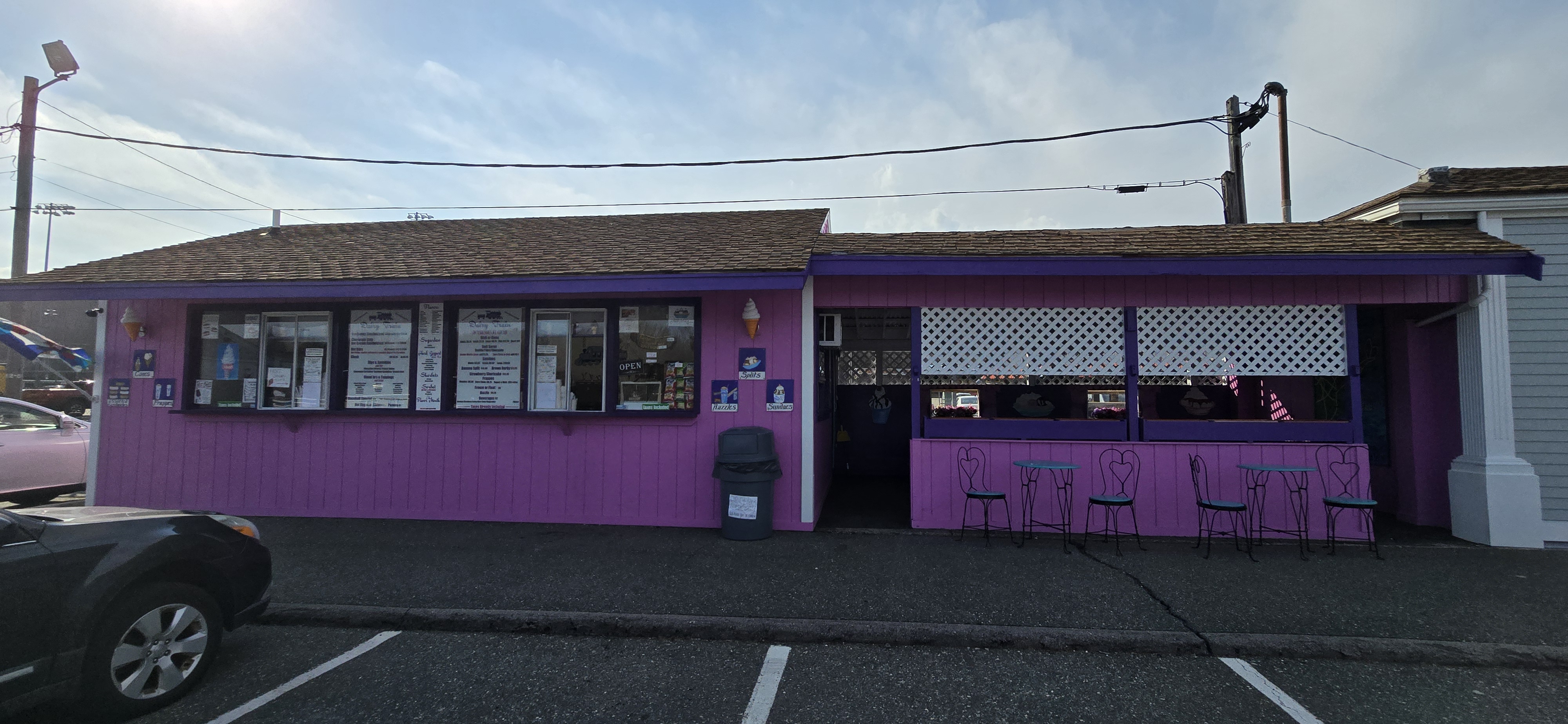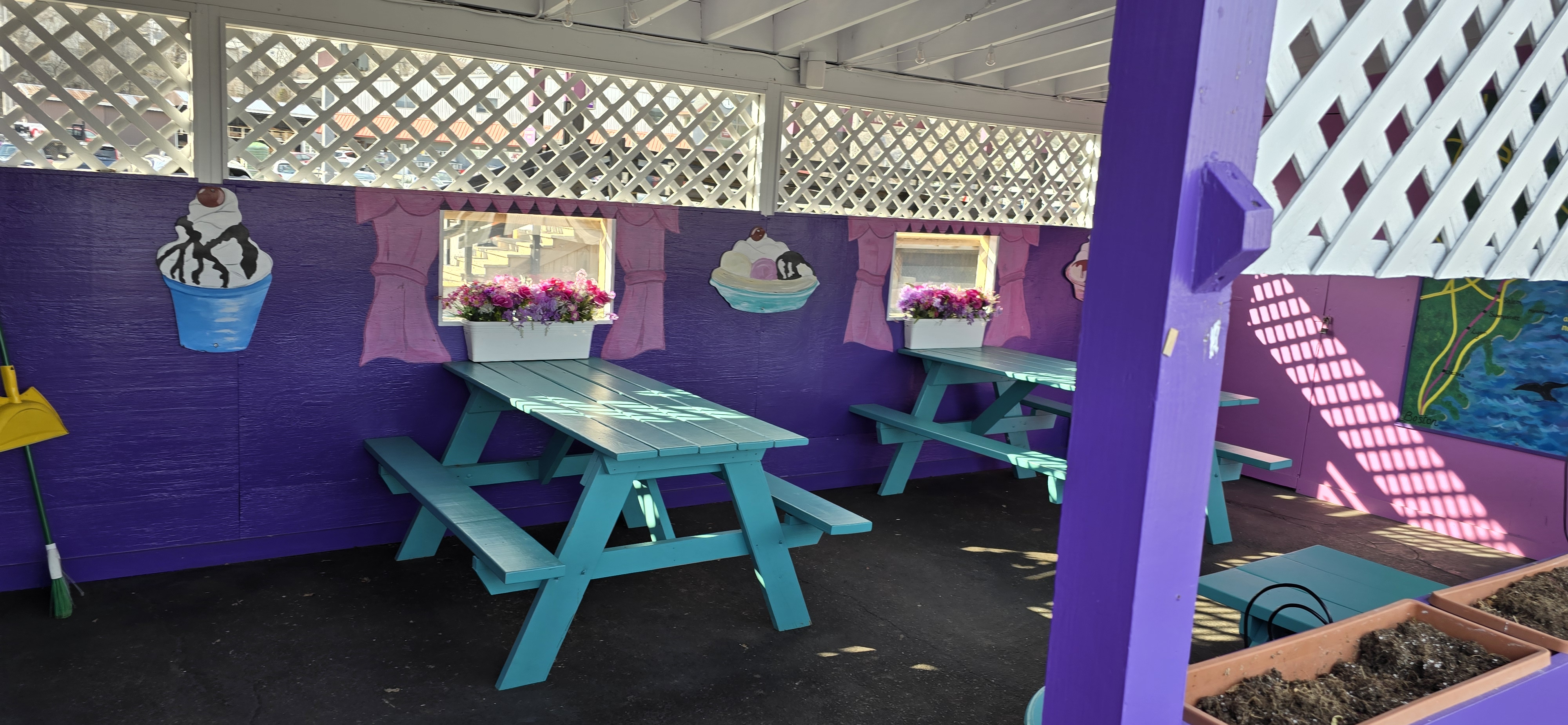 There's no outdoor seating (just a dozen or so spaces of shared parking lot) but the interior space is huge - lots of spread out tables and a long serving counter. They have an unusual number of brightly colored ice cream flavors - some conventional, some you just have to ask about (like "Crazy Vanilla".)