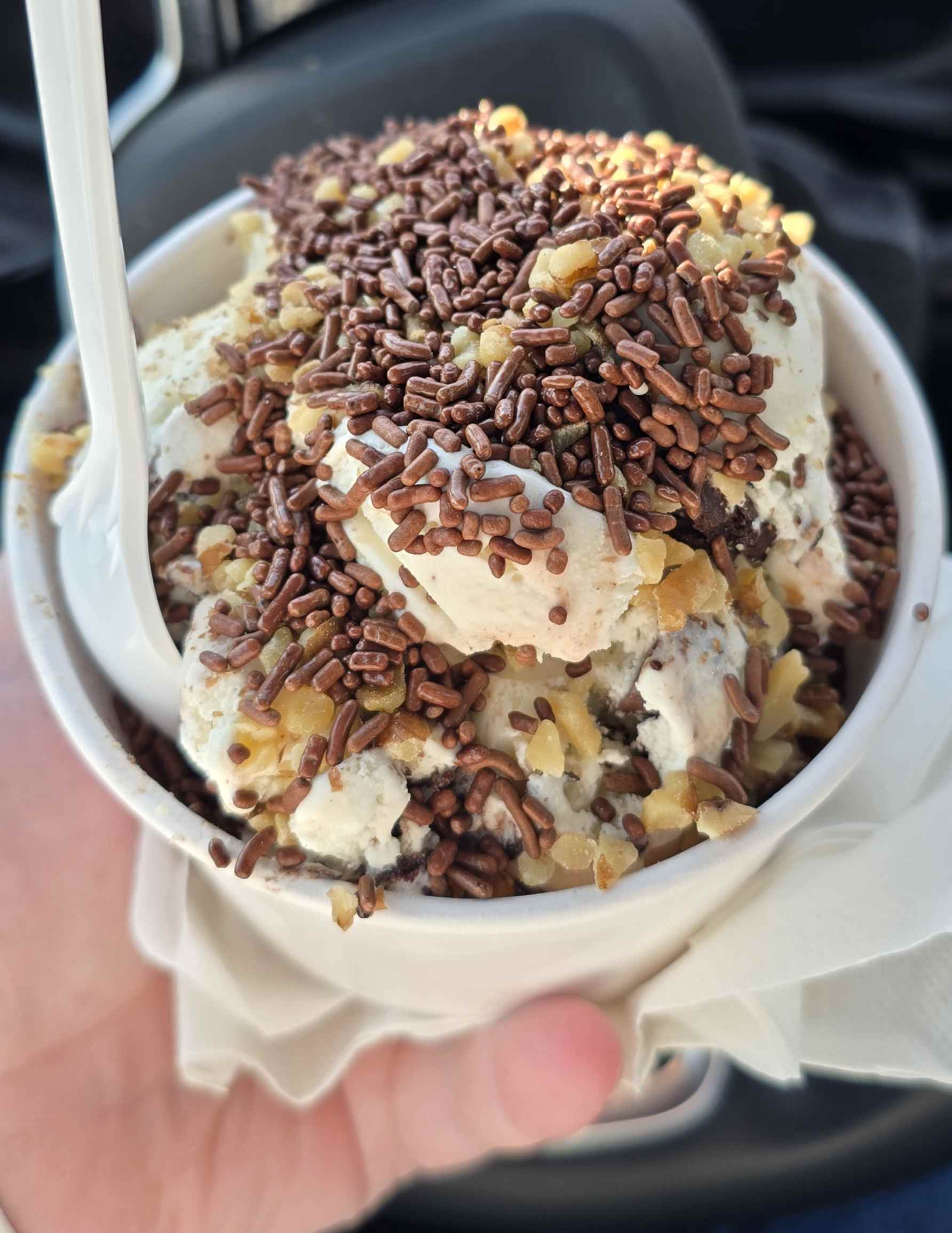 It's probably not clear from the pictures, but the large was an enormous amount of ice cream - that cup is five inches across. I may need to start keeping a scale in the car to compare sizes - Massachusetts "large" is usually at least "generous" and "plenty of both flavors" (at some places, large is simply three scoops and they encourage you to pick three different flavors, possibly a predecessor to ice cream "flights") but this goes well beyond "a lot of ice cream" into "you're probably skipping dinner". (This is the first place I've been where I might actually get something smaller next time I visit!)