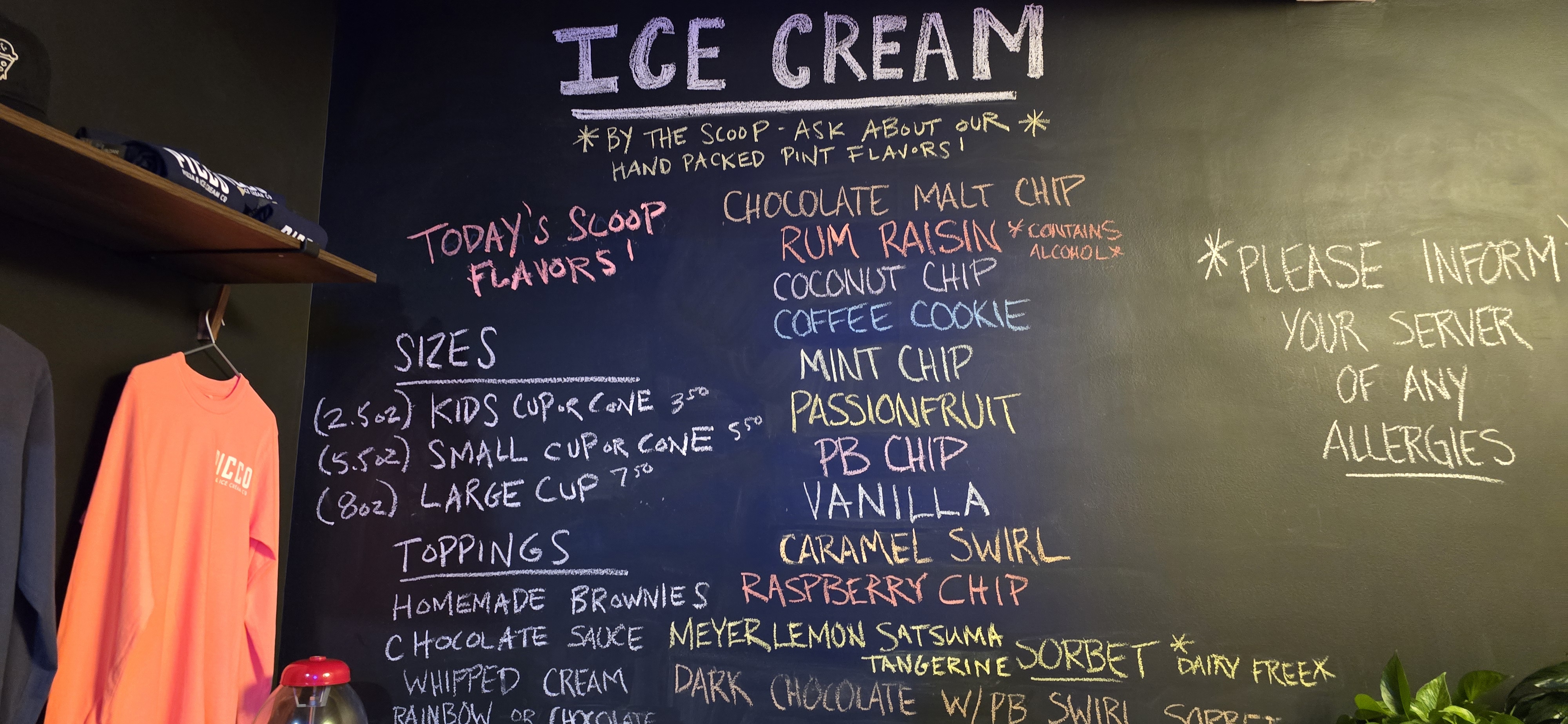 Picco's has an interesting list of flavors and toppings - though they got chopped off in this picture, rainbow and chocolate sprinkles, along with whipped cream and chocolate sauce; they make their own ice cream, with no eggs, and the sorbet is dairy-free, and apparently the things that can be gluten-free (not, for example, the ones with cookies mixed in) are gluten-free, it's not just a few specific items.