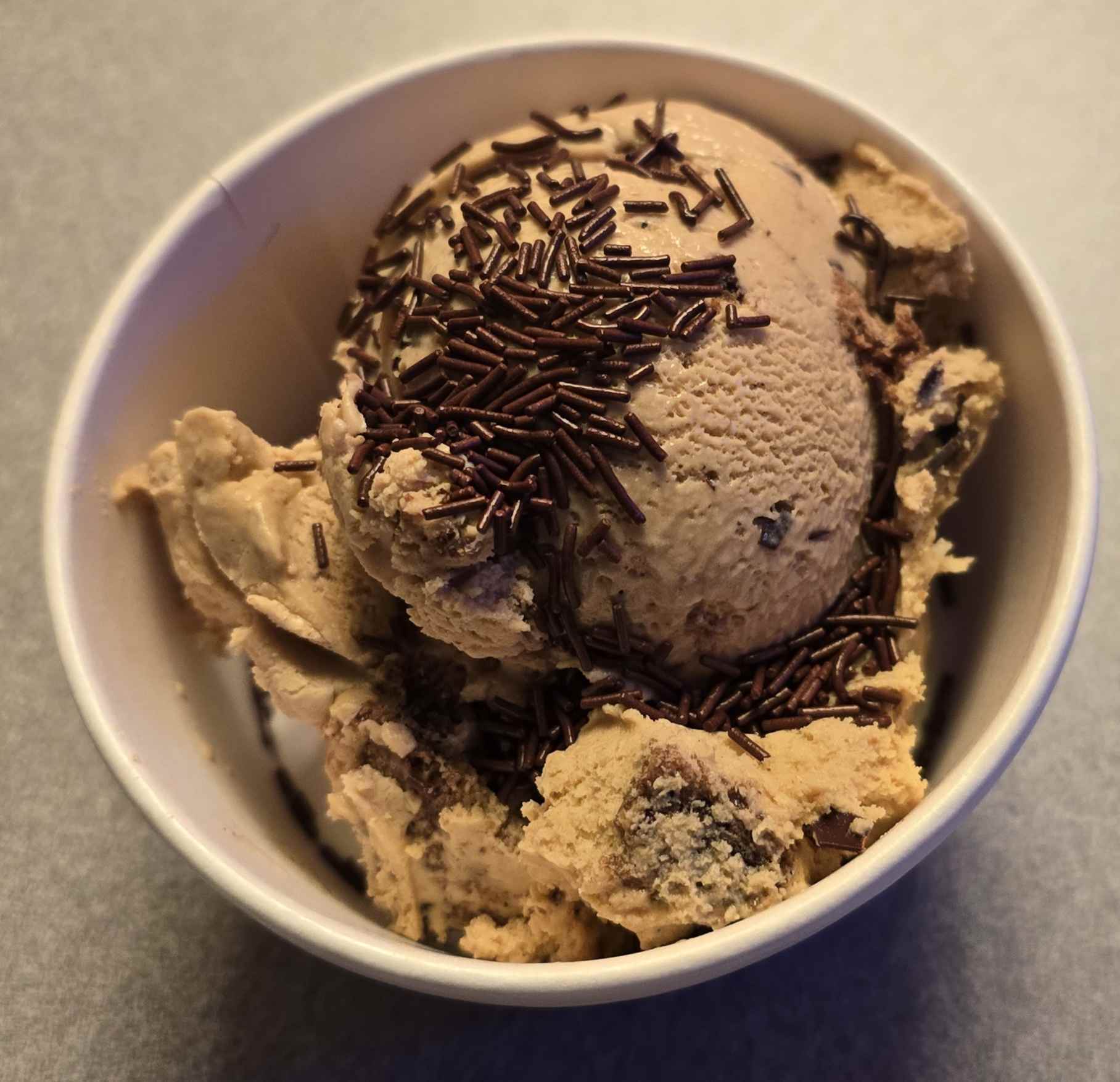 A closeup of the Extreme Chocolate ice cream itself, without the layer of Jimmies hiding it.